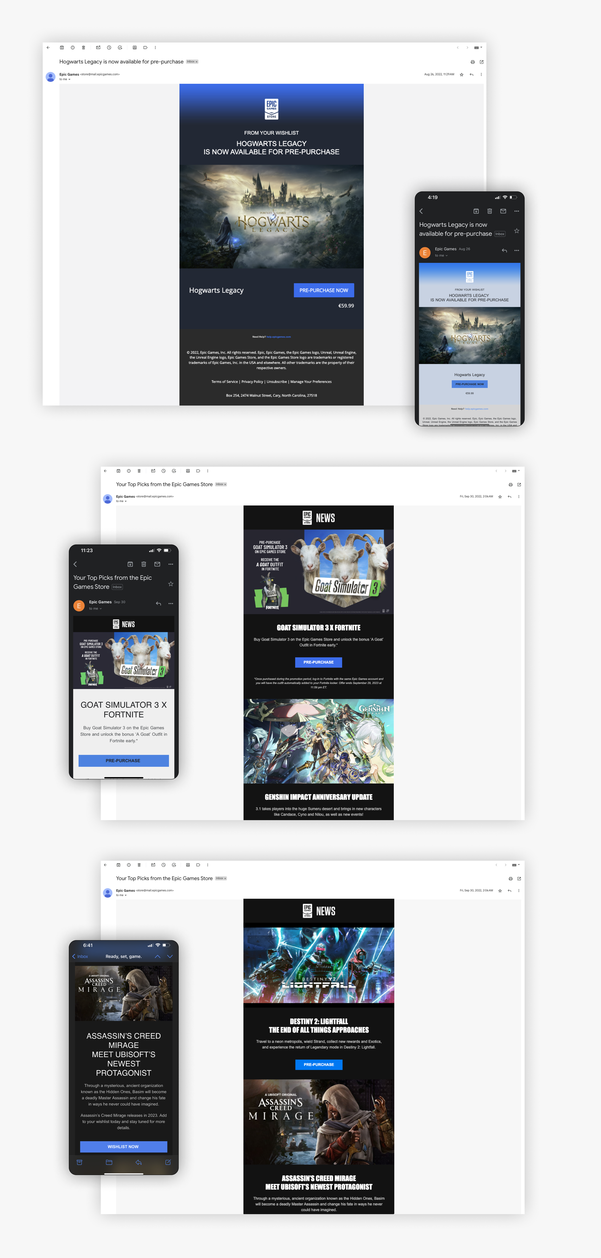 Types of emails: triggered Epic Games Store notifications, sales + special initiatives, recurrent newsletter, and informative emails.